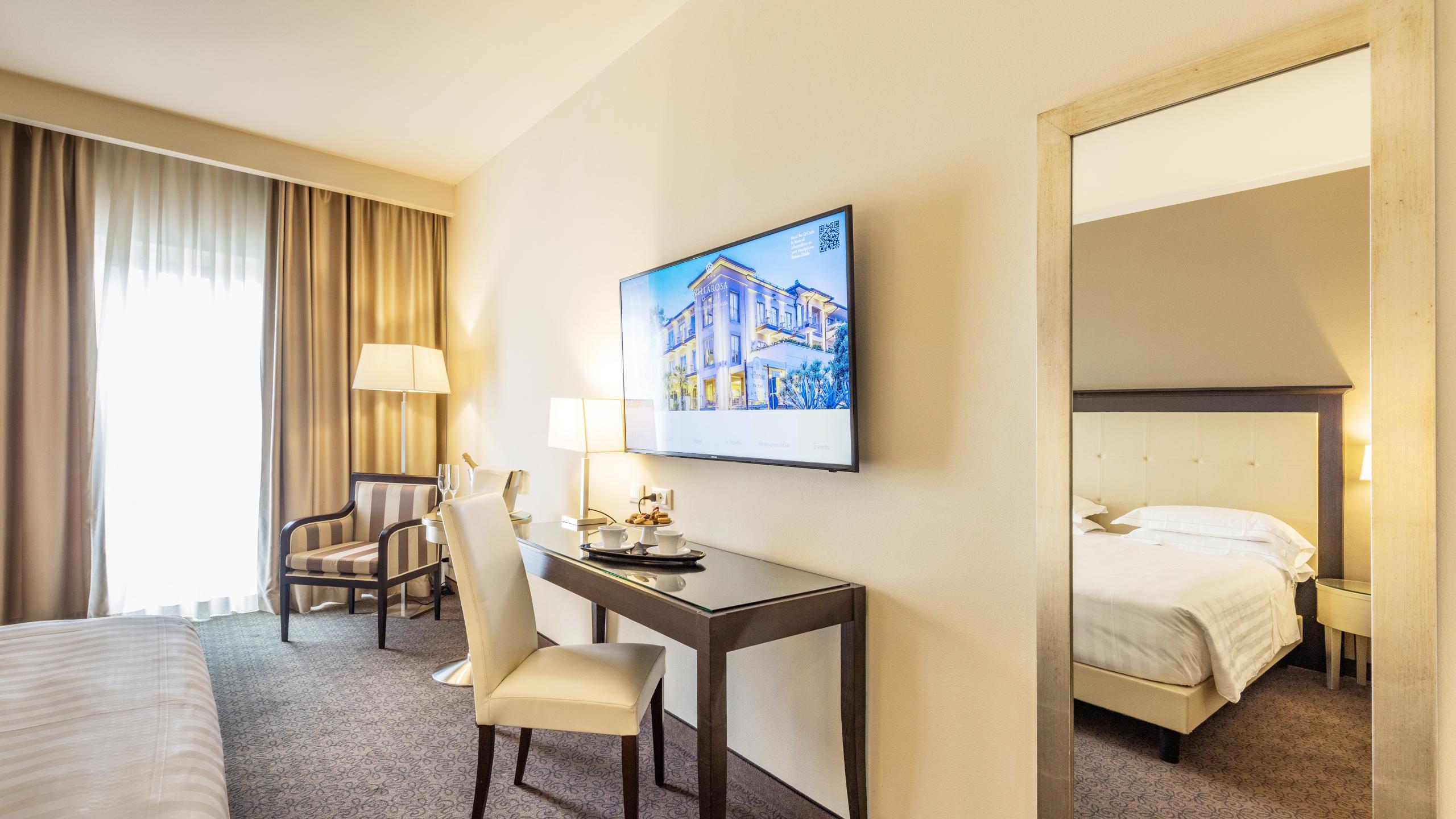 Die Juniorsuiten sind hell, elegant und überaus luxuriös. Sie verfügen über einen Balkon mit Seeblick, WLAN, Klimaanlage, UHD-Smart-TV mit Sky-Programm und 70 internationalen Kanälen, Minibar, Safe, Wasserkocher, Bademantel und Slippers, Kingsize oder Twin Bed mit „Privilege Beautyrest“-Matratze von Simmons und hochwertiger Bettwäsche für erholsame Nächte. Das helle Marmorbad mit goldenem Mosaik ist mit einer Badewanne mit Dusche, einem Föhn und einem Pflegeset von Hydrobasic ausgestattet.